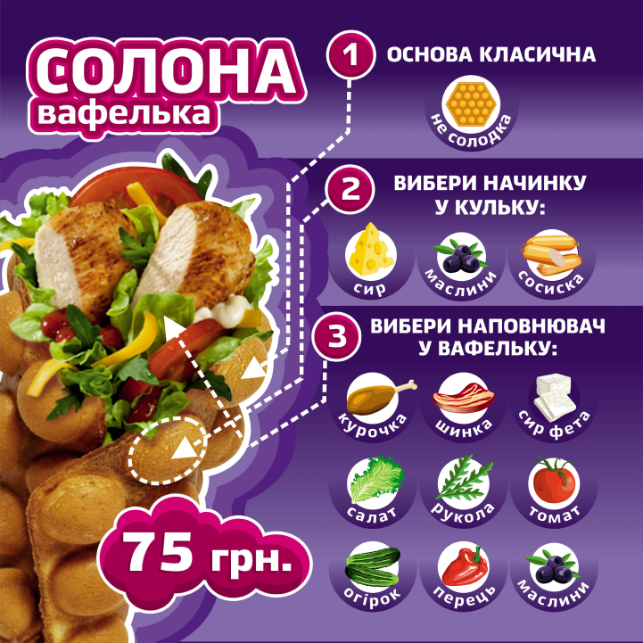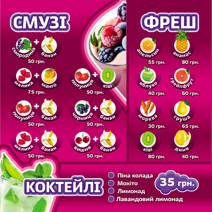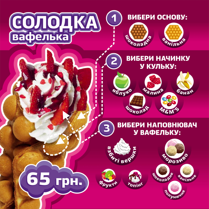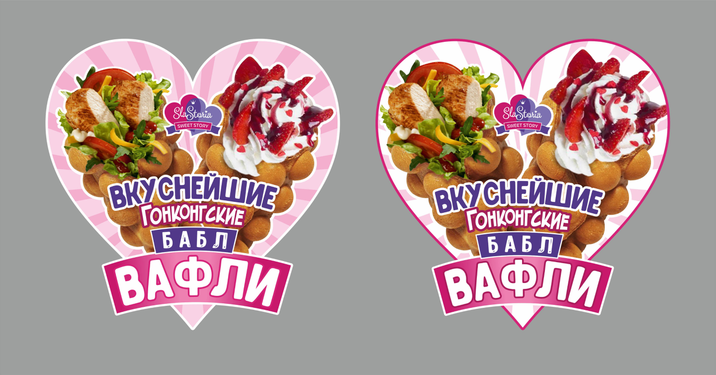 Киоск был оформлен в корпоративных цветах (розовый и лиловый) с гармоничным размещением по периметру изображений фирменных вафель, сладостей, фруктов и ягод. Также была выполнена прорисовка всей продукции клиента, согласно его предоставленных данных о составляющих десерта.