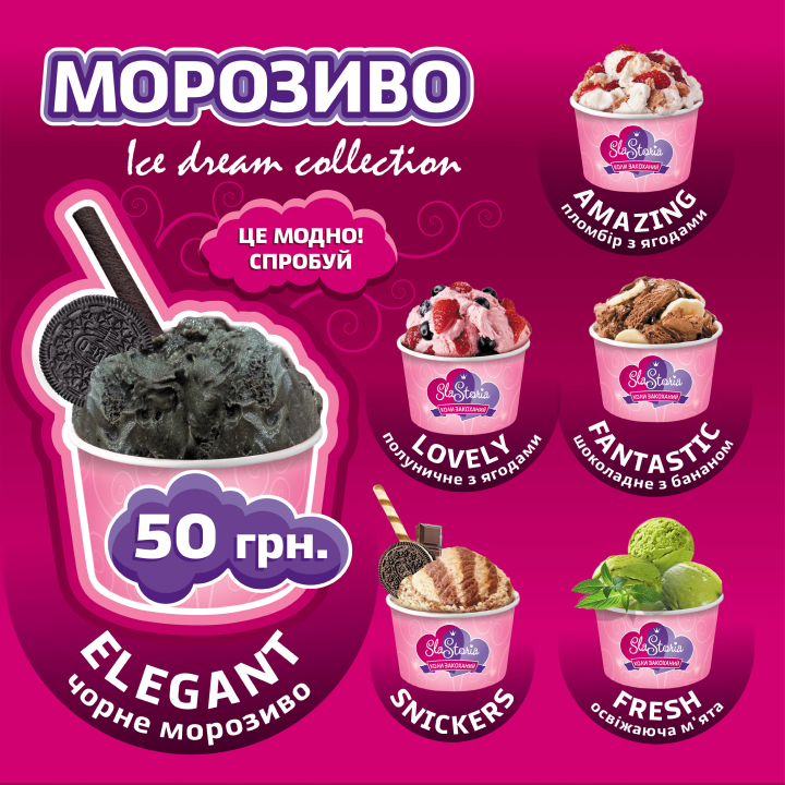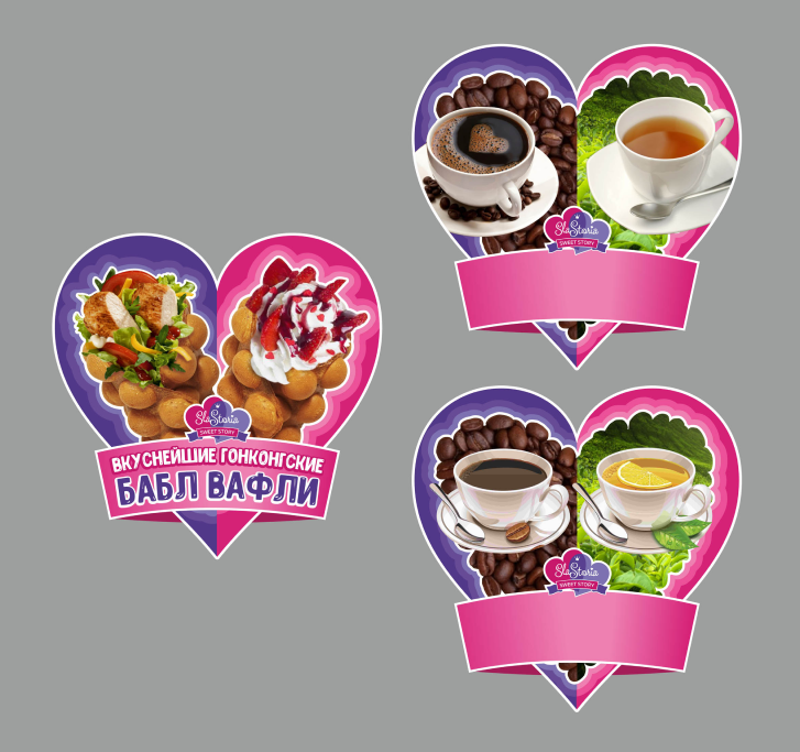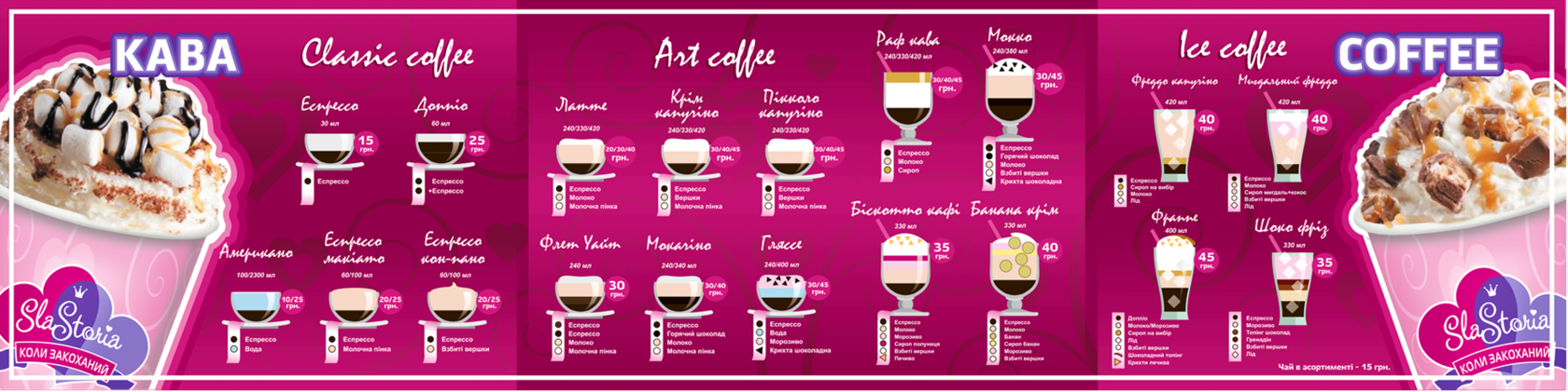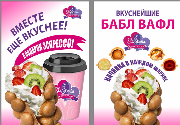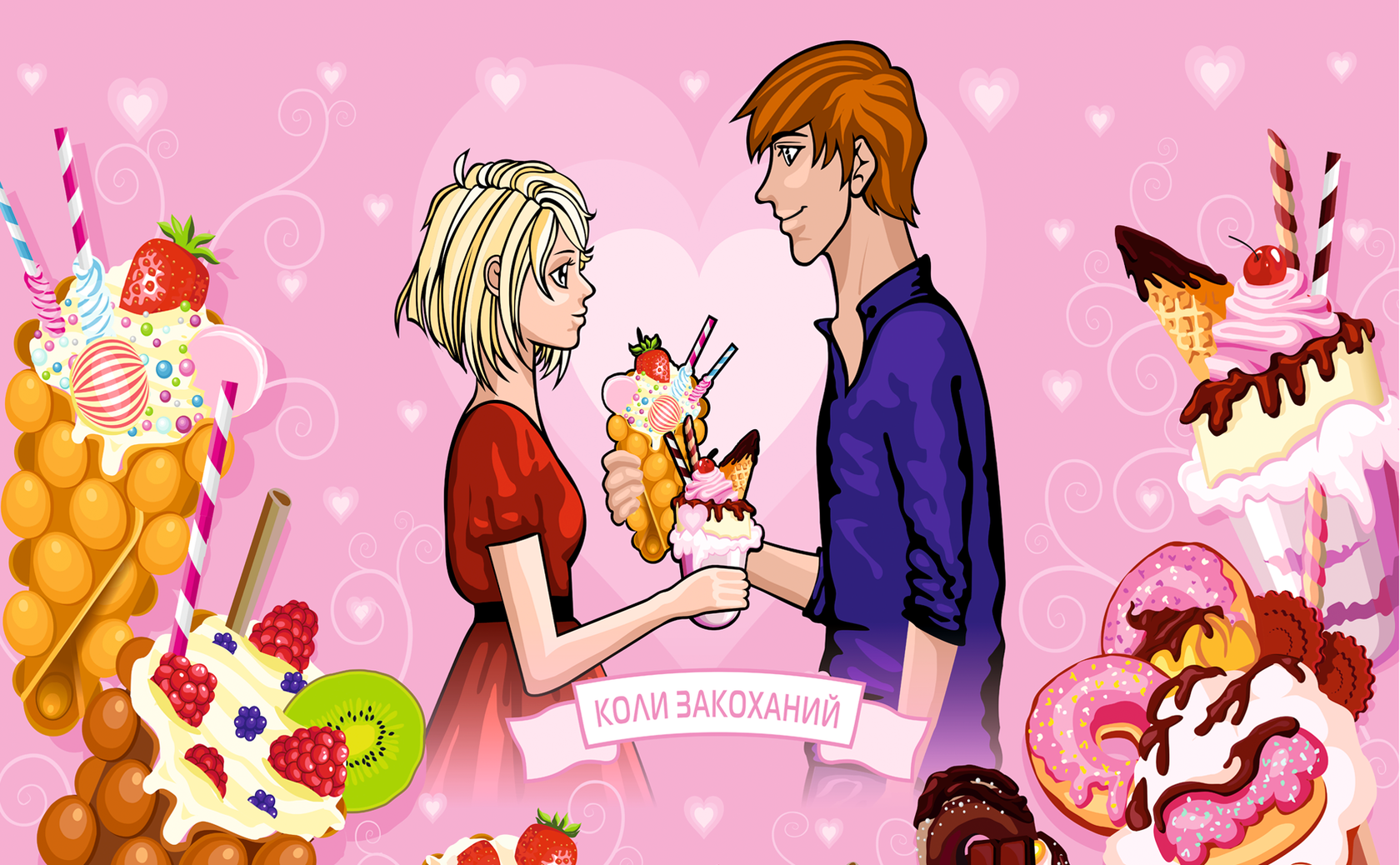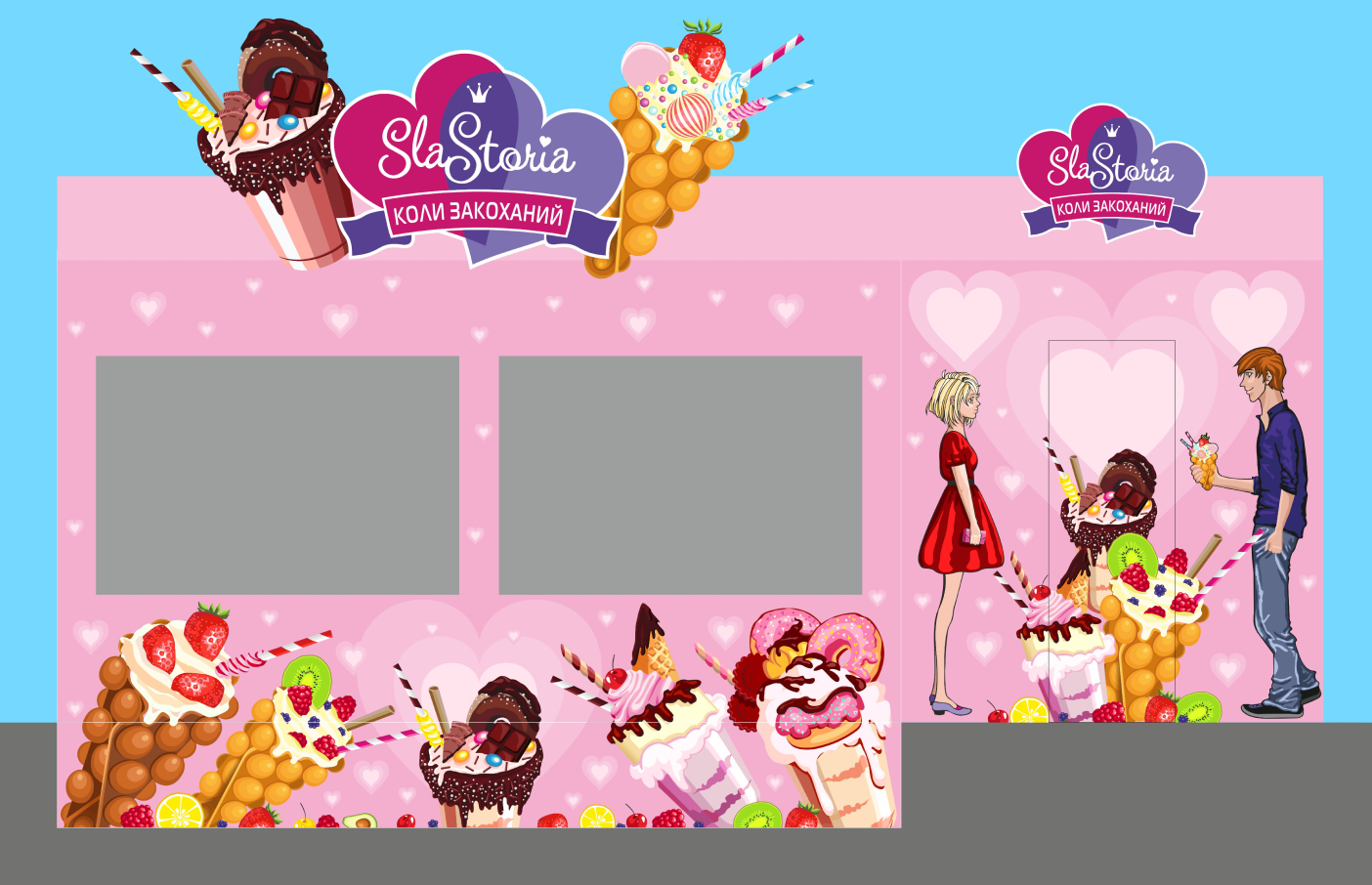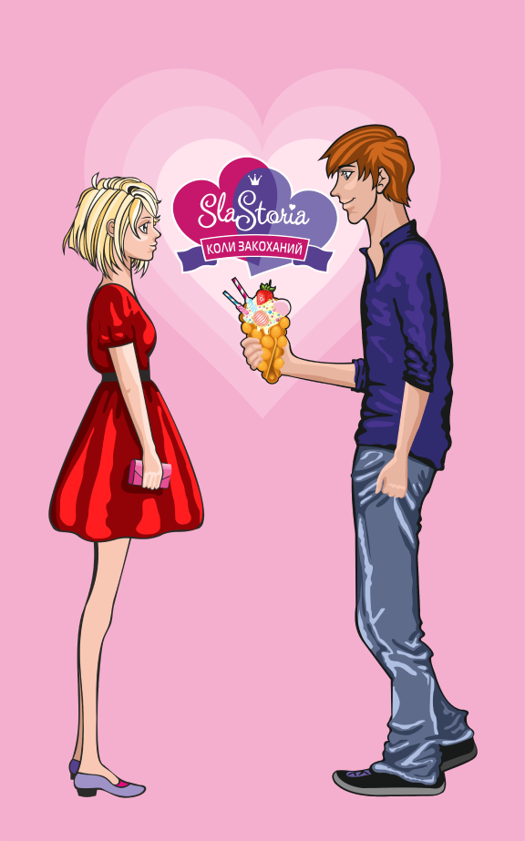 Решение для разработки фирменного стиля вылилось из самого названия SlaStoria - история молодых людей, когда парень угощает свою девушку сладкими вафлями во время романтичной прогулки. Таким образом, фирменный стиль должен был быть очень милым, романтичным, ярким и красивым. Поэтому в качестве корпоративных героев была выбрана влюбленная пара, а для логотипа два перекрывающих друг друга (сплетенных вместе) сердца ярко-розового и нежно-лилового цветов, подчеркнутых слоганом кофейни: "Коли закоханий".
