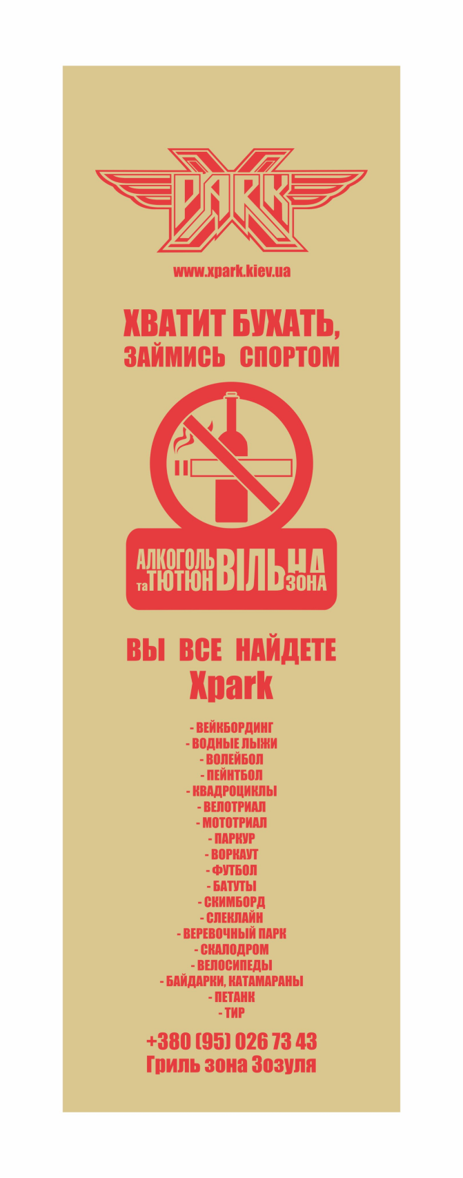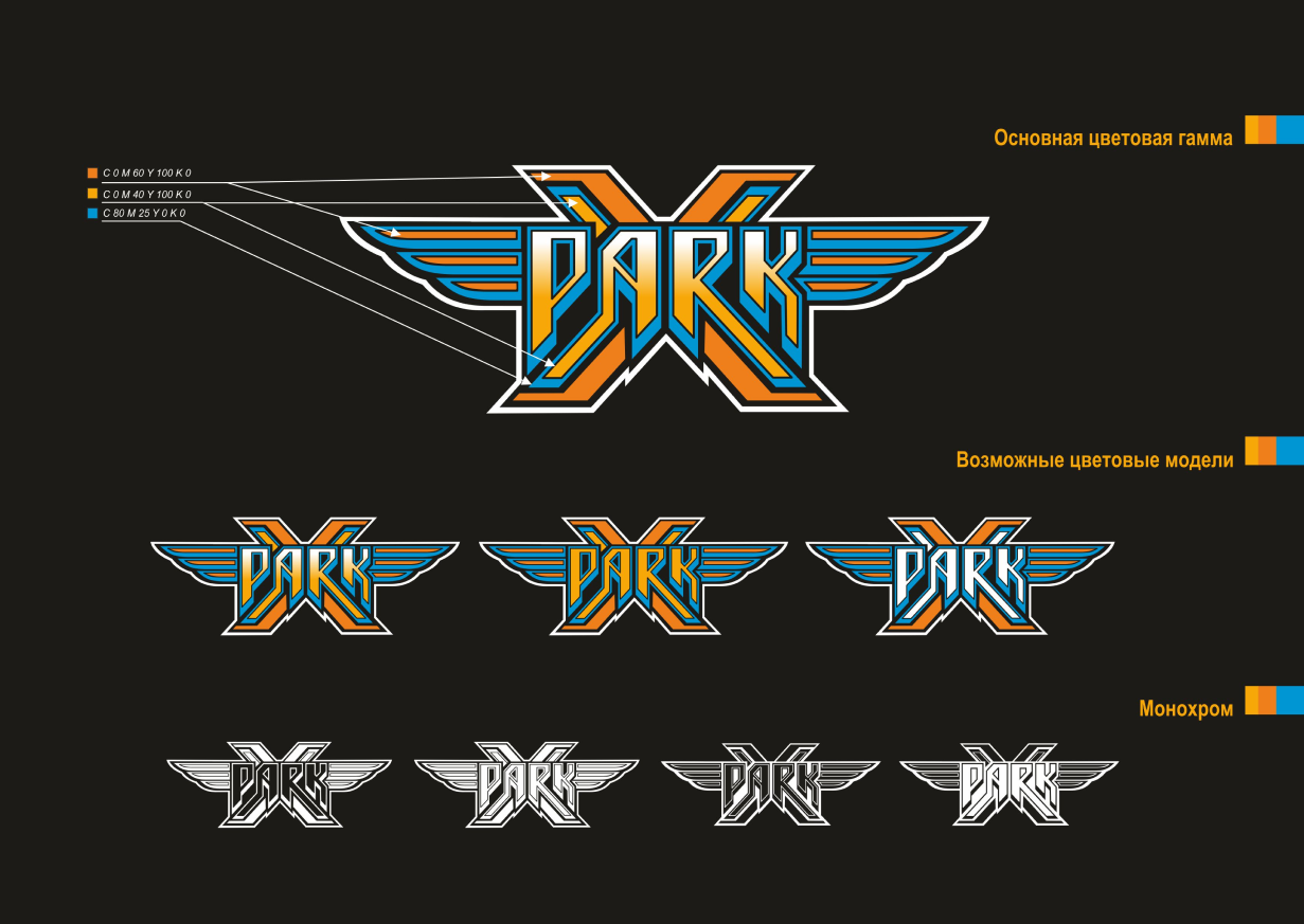 Клиент пришел к нам уже с новым названием "X-Park", которое было создано от сокращения словосочетания "экстремальный парк". Мы же начали трансформацию фирменного стиля с разработки нового логотипа. Новое название само по себе диктовало, что работать необходимо в экстримальном направлении - острые углы, статическая композиция шрифта, грубые прямоугольные формы. А для равновесия целостности иллюстрации и шрифта были добавлены "байкерские" крылья.